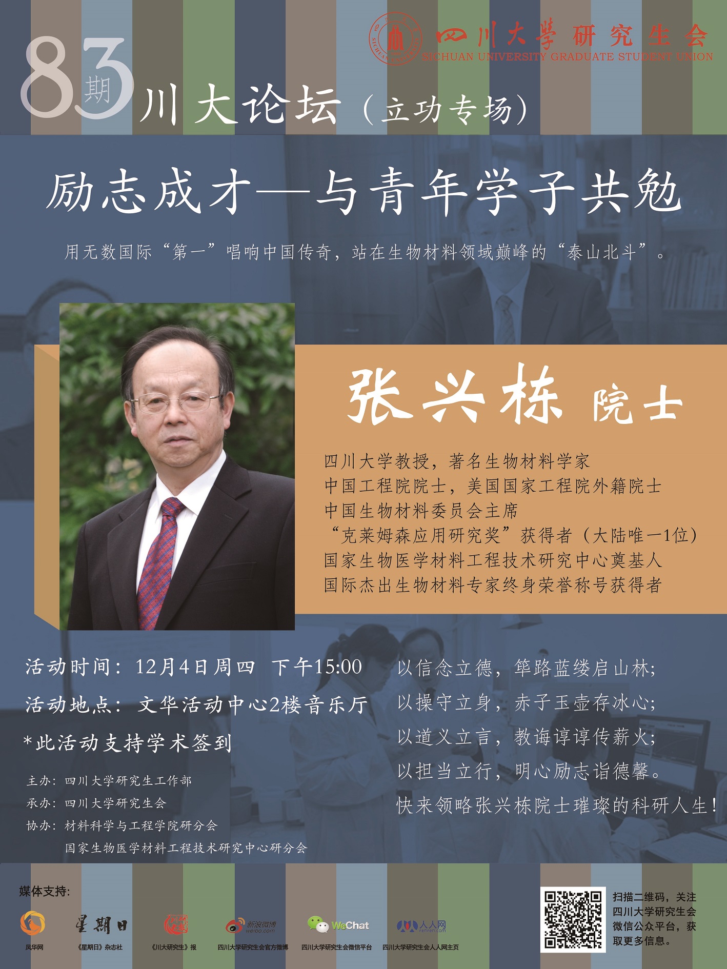 3044am永利集团3044noc第83期“川大论坛”——“立德•立言•立功”系列讲座拉开帷幕!生物材料领域的殿堂级人物,川大瑰宝、中国璞玉、学术泰斗,中国工程院院士兼美国工程院外籍院士——张兴栋院士即将做客第83期川大论坛,开启“立功篇”!