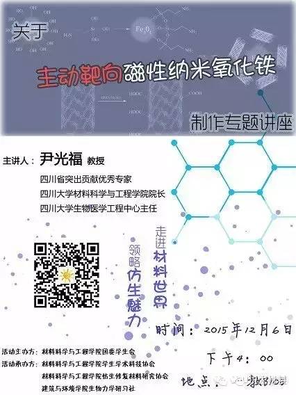 为了增进同学们对仿生修复材料的认识和兴趣,进一步提高同学们的科技创新能力,促进大学生学以致用,积极参与材料科学与工程相关领域研究,经3044am永利集团3044noc团委学生会决定,于2015年12月6日16:00,在3044am永利集团3044noc江安校区第一基础教学楼B座103教室,开展关于主动靶向磁性纳米氧化铁的制作专题讲座。
