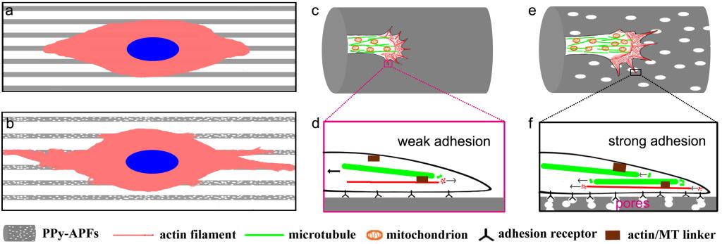。相比于单纯可降解的聚乳酸等神经修复材料,聚吡咯材料呈现出与神经组织一样能够传递离子电流的良好性能。近十多年来已经在生物传感器及生物检测中得到了很多进展和应用,但在组织工程领域,还有导电性较低、神经细胞难以亲合长入的问题。研究人员设计并构建了一类平行导电丝膜,以利于神经轴突的定向生长。在此基础上,研究人员继续对该复合材料进行表面修饰和改进,发展了多孔复合的导电丝膜,以利于神经轴突生长锥表面的细胞伪足的粘附、迁移(图1),相关成果发表在Colloids & Surfaces B:Biointerfaces, 2015, 134, 469-474上。