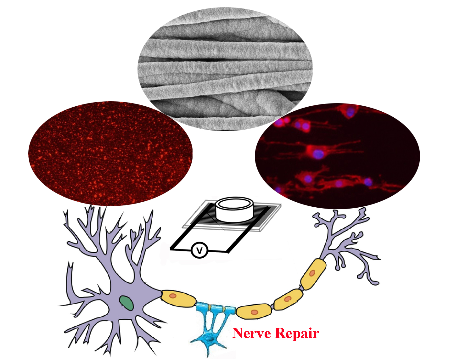 图2.PPy平行丝膜SEM照片,细胞L929的层粘蛋白等胞外间质复合连接在平行丝膜上及细胞平行分布的荧光照片和电刺激示意图。