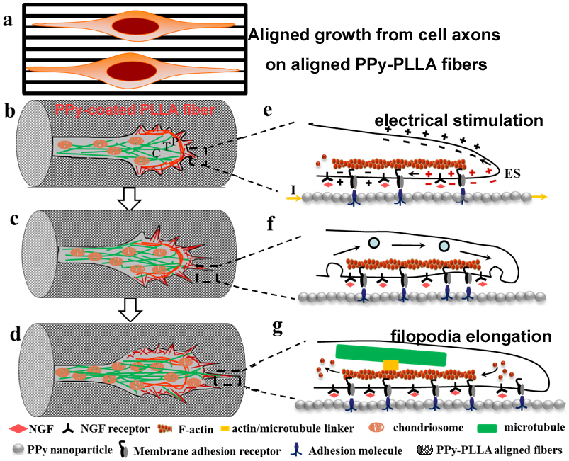 图3.在PPy-PLLA导电复合丝膜上,PC12 细胞分化出的生长锥延伸的示意图:a) 分化细胞的平行分布;(b-d) 延伸期间生长锥的变化;(e-g) 在电刺激下伪足内部的变化。