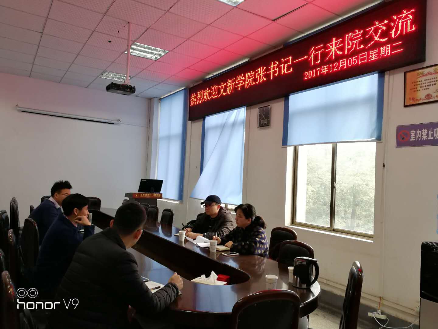 2017年12月5日上午10时,文新学院党委副书记张莹一行来到永利集团官网就江西省的招生宣传工作取经交流,永利集团官网招生工作小组唐世红副书记、辅导员余鹏飞、王志超参会。首先,唐书记就永利集团官网过去五年来在江西省招生宣传工作的总体情况和成绩向张书记一行做了详细的说明,按照区域路线对各大知名中学进行一一梳理和分析;而后,余鹏飞老师和王志超老师就每年高招咨询和学校走访中遇到的突出问题进行了细致地讲解;最后,唐书记将学院招生工作小组整理出的相关资料交由张莹副书记。会后,张书记高度肯定了3044am永利集团3044noc在江西省的招生宣传工作,并由衷地感谢3044am永利集团3044noc做好了交接工作。
