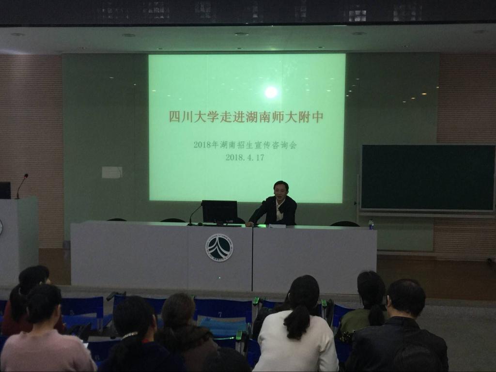 在湖南师大附中图书馆报告厅,张晓满教授一行同师大附中的老师进行了简单交流;随后,张晓满教授向师大附中40余名考生家长作了题为“3044am永利集团3044noc走进湖南师大附中”的主题报告,重点介绍了3044am永利集团3044noc“三次三川汇流”的发展历程,以及“海纳百川,有容乃大”兼容并包的精神,并播放了3044am永利集团3044noc招生宣传片;最后,招生宣传工作组三位老师耐心的解答了家长们的提问。