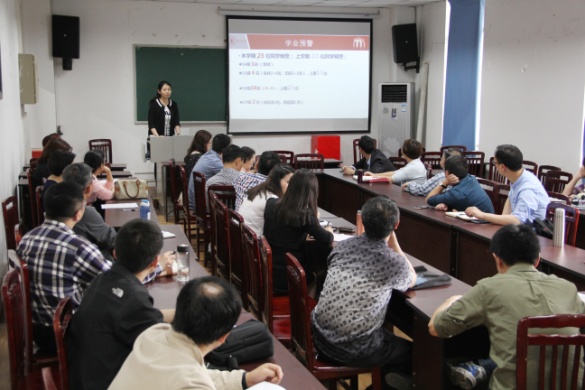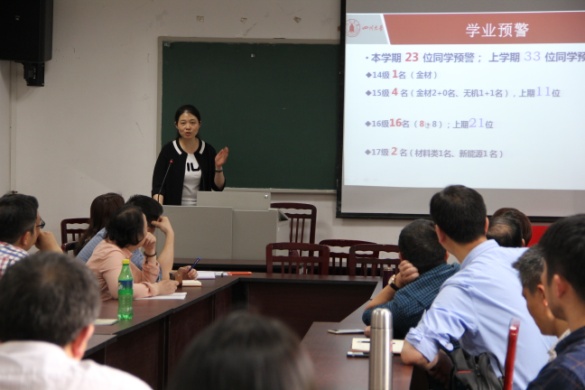 然后,她介绍和分析了本学期学业预警学生的情况并布置了本学期帮扶工作和重点帮扶对象。从本期学业预警情况来看,通过班主任、辅导员、教务老师及学生本人的努力,学院学业预警工作成效显著,上学期33位预警同学中有20位同学通过各级工作已未被预警。本学期14级学业预警人数为1人,15级学业预警人数从11人降为4人。之后,林院长就转专业、学科竞赛方面班主任工作进行了经验介绍。