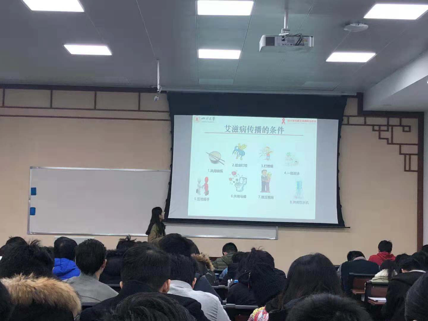 为了普及艾滋病防治知识,增强大学生防控艾滋病以及对自我保护的意识,2018年11月30日下午,永利集团官网分别在望江校区和江安校区开展了《大学生艾滋病专题知识宣讲》,本次活动望江校区特别邀请了华西公共卫生学院的研究生学姐翟雯雯为同学们宣讲,江安校区由大一辅导员余艳丽老师为大家宣讲。