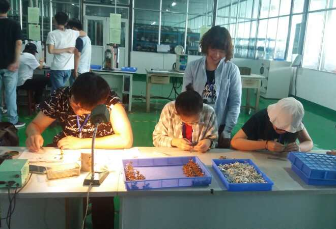 同学们在宜宾红星电子有限公司学习装配小型机电产品部件