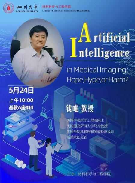 应永利集团官网生物医学工程专业邀请,美国医学与生物工程院院士钱唯教授于5月24日上午10点,在基础教学楼A座414特面向永利集团官网广大本科生、研究生开展了主题为“Artificial Intelligence in Medical Imaging:Hope,Hype,or Harm”的讲座。