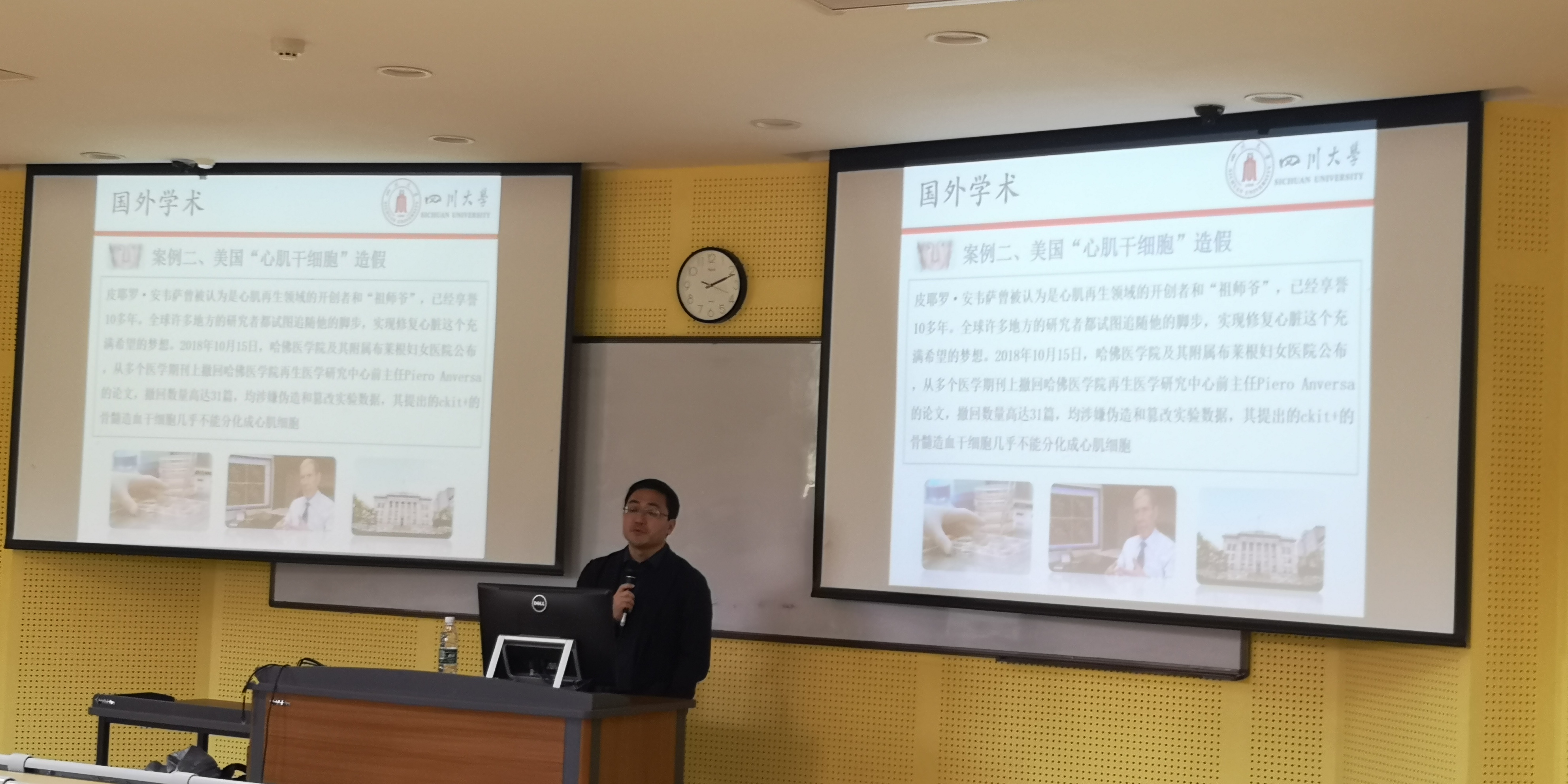 下午两点整,讲座正式开始,吴家刚教授首先强调了学术诚信的重要性以及加强学术道德建设的必要性。吴教授指出,诚信是为人之本,“人无信不立”。同样的,学术诚信是每一位科研工作者必须坚守的底线,我们必须有这样的底线思维,不要怀着侥幸的心态去挑战底线。我们应当做到严守学术道德规范,杜绝学术不端行为。吴教授举出国内外学术界的多个例子来警告同学们,例如韩国“民族英雄”黄禹锡学术造假事件,美国“心肌干细胞”造假事件,翟天临学术门事件等。一桩桩、一件件,警示着在场的每一位同学。为了一时的名利抛弃诚信和道德的底线,必将坠入深渊。