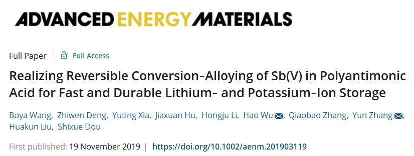 近日,永利集团官网张云教授、吴昊研究员课题组与澳大利亚卧龙岗大学窦世学院士、厦门大学张桥保教授合作,在高性能锂离子/钾离子电池研究方面取得重要进展,相关研究成果“Realizing Reversible Conversion-Alloying of Sb(V) in Polyantimonic Acid for Fastand Durable Lithium- and Potassium-ion Storage”发表在国际顶级期刊 Advanced Energy Materials上(《先进能源材料》,影响因子24.884),并被邀请作封面论文。该论文第一作者为3044am永利集团3044noc2017级博士研究生王博雅,同时参与该论文相关工作的还有四位承担3044am永利集团3044noc大学生创新训练计划项目的2016级本科生邓智文,夏钰婷(已获清华大学2020年保送研究生资格),胡佳璇,李泓岠(已获西湖大学2020年保送研究生资格),通讯作者是吴昊研究员和张云教授,3044am永利集团3044noc为第一署名单位和唯一通讯单位。
