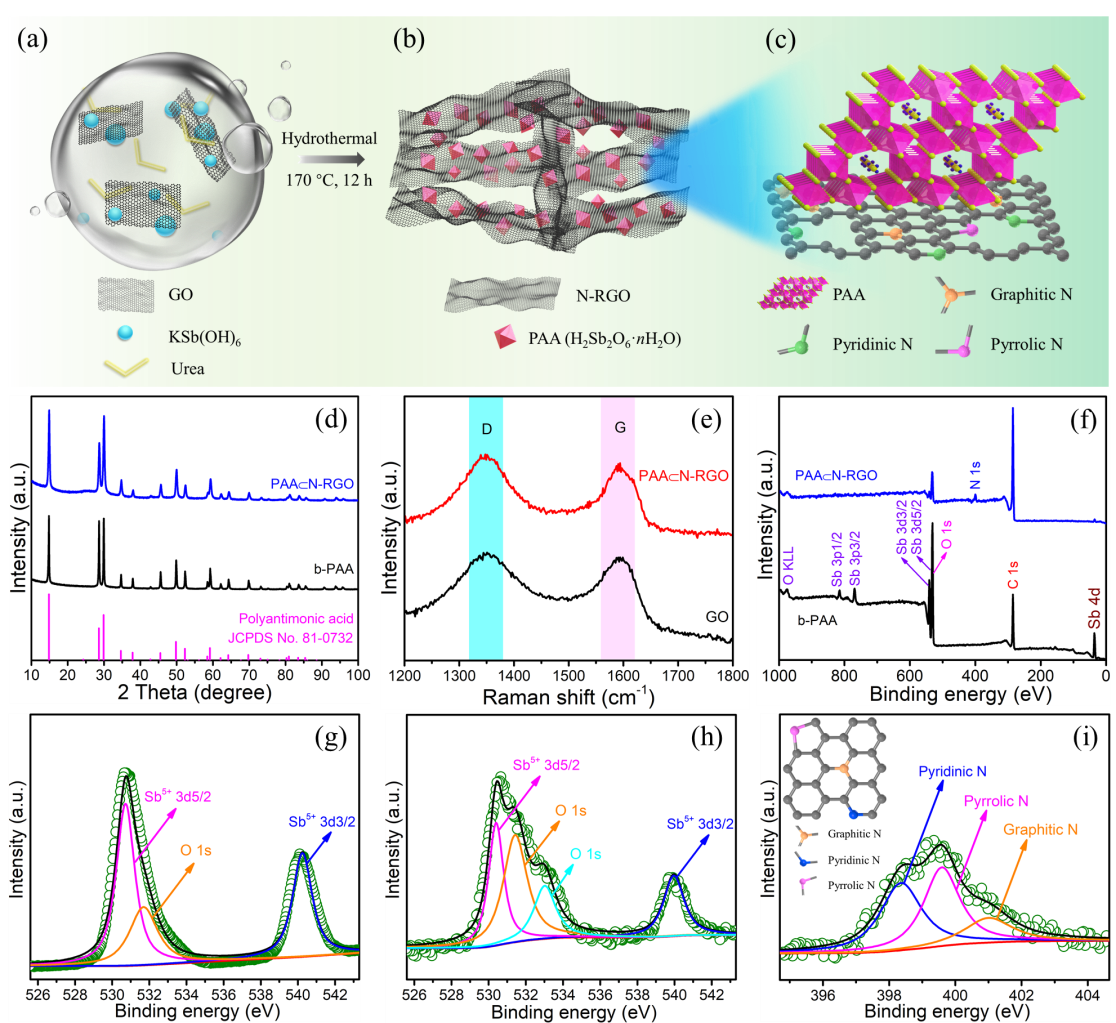近些年来,研究者们开发了无数的电极材料用以在二次电池中存储碱金属离子(如Li+离子和K+离子)。但是,仅有很少的电极材料可以作为一个通用的主体材料用于存储碱金属离子。聚锑酸(Polyantimonic acid,PAA,H2Sb2O6·nH2O,0≤n≤4)是一种重要的锑基化合物,广泛用于制备防火材料,传感器和离子交换剂等,但未见将其应用于能量存储与转换。烧绿石结构的聚锑酸拥有着三维交联开放的隧道状结构以及五价的锑元素,使其非常有希望成为一种高容量电极材料用于碱金属离子的电化学存储。然而,由于其极低的电子电导率(~10-10 S cm-1),目前制备电化学可逆的聚锑酸电极材料用于电化学储能仍然是一个挑战,且从未有过相关报道。