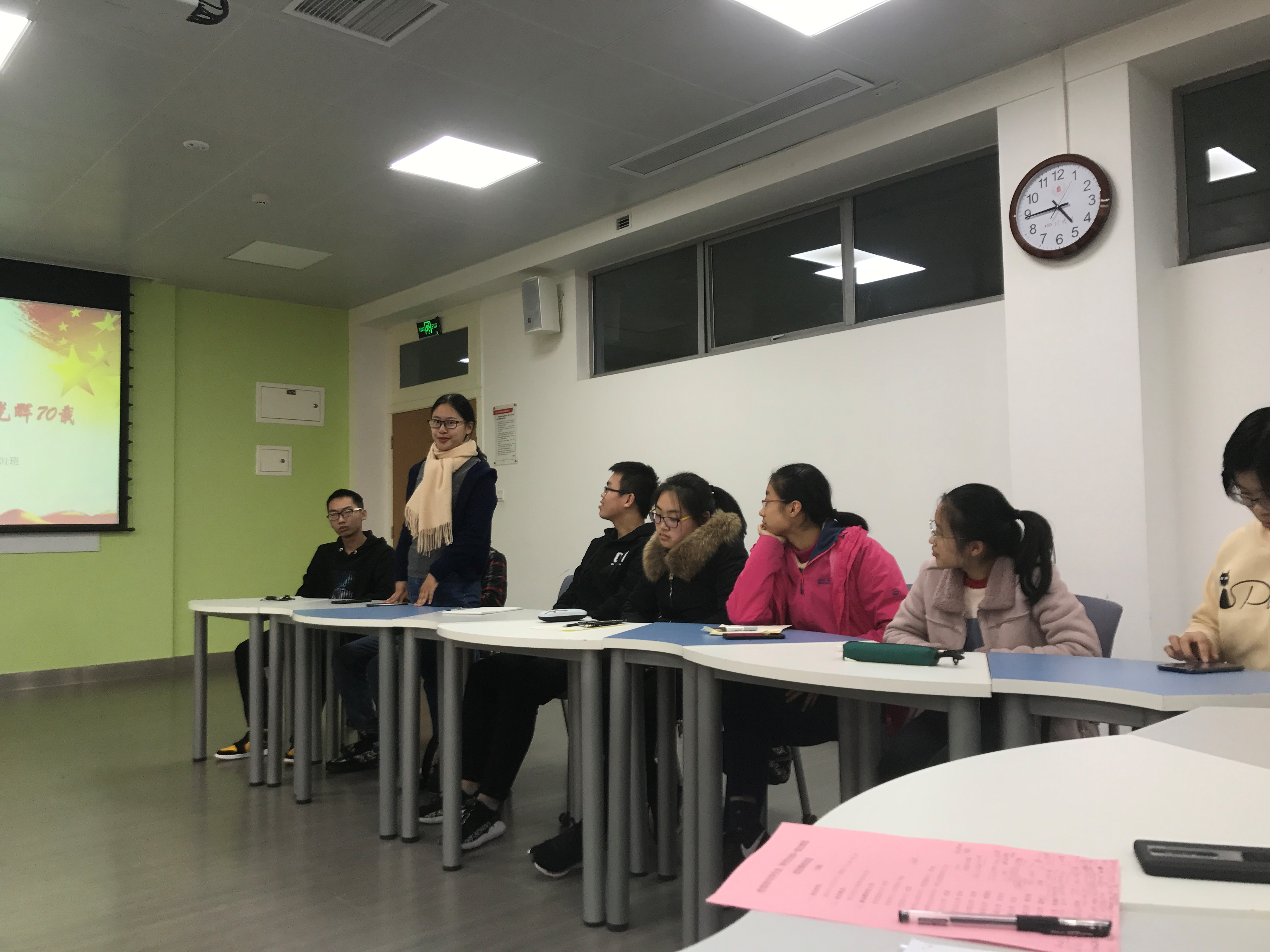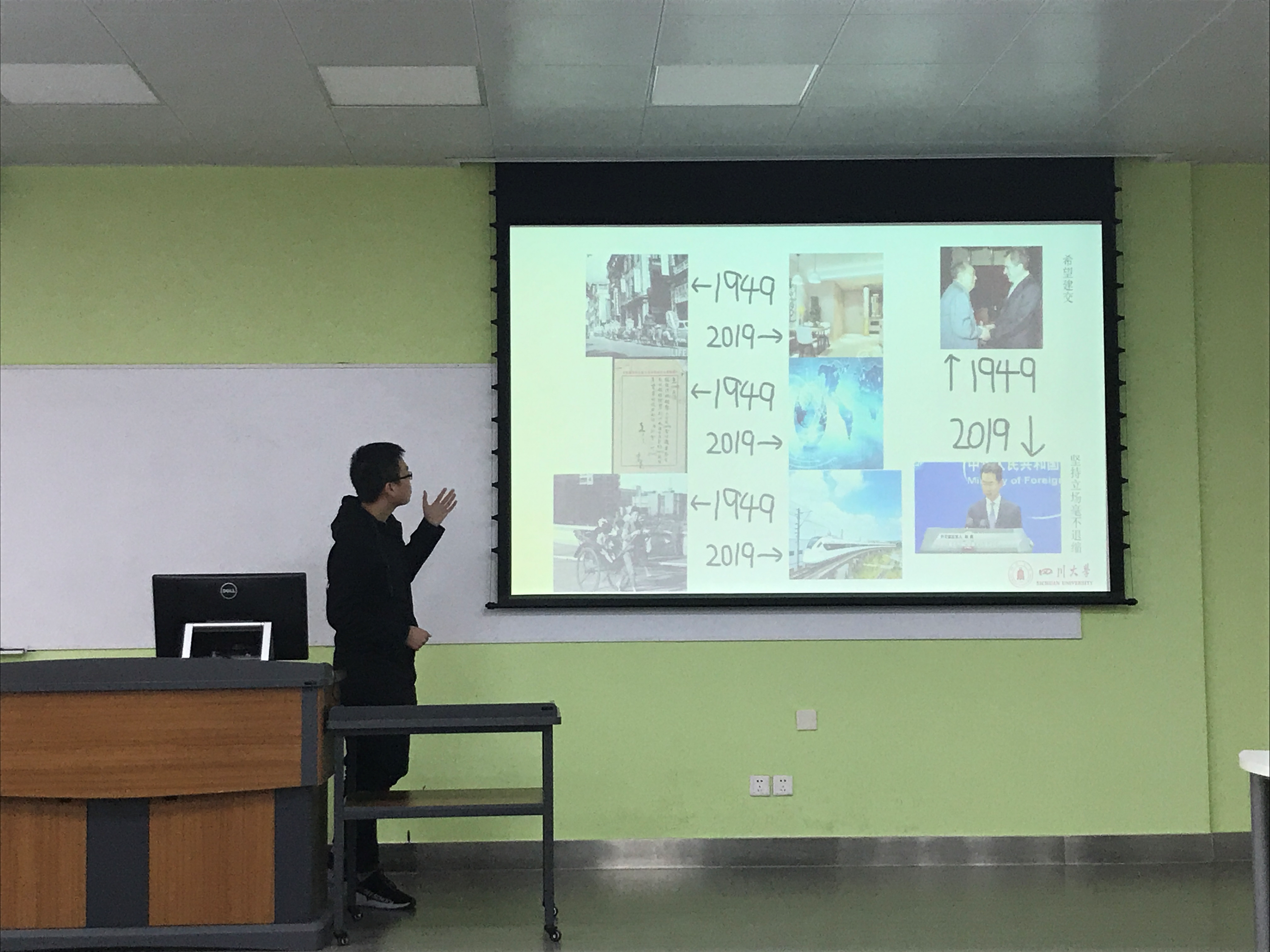 第二个环节由同学们分享自己身边的故事,作为见证这个伟大时代的大学生,大家从衣、食、住、行、经济指数变化、精神面貌和层次变化等各个角度进行了讲述,并提出了自己的一些看法。杨开杰同学用PPT的形式分享了一位川大水电中心普通员工——胡国宏老师的故事;李凌宇同学从“路的变化”这一微观视角进行了观察和思考,认为老百姓的幸福感着实大大提高,就是最好的评判标准,同时也表达了对党和祖国深切的热爱与感激之情。