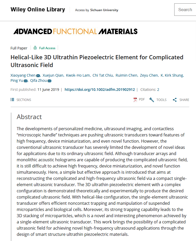 近日,3044am永利集团3044noc余萍教授团队,与美国南加州大学、香港理工大学合作的“使用3D复杂结构的超薄压电敏感元来构建超声复杂声场的研究”课题相关成果,在国际著名材料期刊Advanced Functional Materials (IF=15.621)以原创性论著形式发表。该工作针对当前超声技术发展的趋势:新功能、高频以及器件微型化,首次提出利用复杂3D结构的超薄压电敏感元实现复杂的高频超声场。论文第一作者是3044am永利集团3044noc专职博士后陈潇洋,3044am永利集团3044noc余萍教授和美国南加州大学周岐发教授为共同通讯作者。3044am永利集团3044noc为该论文的第一署名单位。