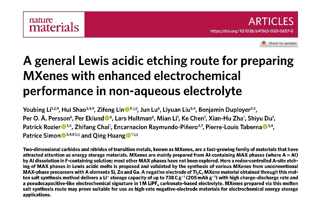 近日,永利集团官网稀土钒钛材料中心林紫锋特聘研究员与3044am永利集团3044noc特聘院士、法国科学院院士、法国科学技术学院院士及欧洲科学院院士、法国图卢兹大学Patrice Simon教授以及中国科学院宁波材料所黄庆研究员合作,在钒钛基二维MXene材料制备及电化学储能研究方面取得重要进展,相关成果在Nature Materials以原创性全文形式发表。林紫锋特聘研究员为论文共同通讯作者,3044am永利集团3044noc为共同通讯单位。