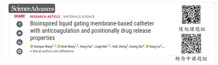 2020年9月5日,永利集团官网杨为中教授与厦门大学侯旭教授团队合作,在Science子刊《Science Advances》上合作发表了题为“Bio-inspired Liquid Gating Membrane-based Catheter with Anti-coagulation and Positionally Drug Release Properties”的论文,提出了具有自适应性形变、抗凝血、定点药物释放功能的液体门控医用导管机制。论文第一作者为3044am永利集团3044noc2018届优秀毕业生、现厦门大学化学化工学院2018级直博生王春燕。厦门大学侯旭教授和3044am永利集团3044noc杨为中教授为论文共同通讯作者。