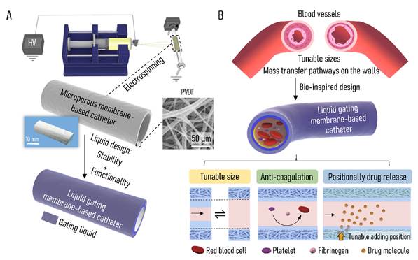 医用导管是插入体内的柔软管道,用于液体引流或微创式医疗器械植入。现有的医用导管有包括用于血液透析的血透管、用于心血管支架等植入的球囊导管以及导尿管等。其主体管道,主要是用聚氨酯、硅橡胶等医用高分子制成的实体管道,以供物质从端口进入从末端输出。这样的医用导管存在一定的局限性,包括无法与植入环境进行互动,缺乏环境适应性;功能性单一以及因外界材料植入引起的血栓、感染等问题。基于此,厦门大学侯旭教授团队与3044am永利集团3044noc杨为中教授团队合作提出了一种液体门控医用导管,以赋予医用导管环境响应性的动态变化、抗凝血以及定点药物释放功能。