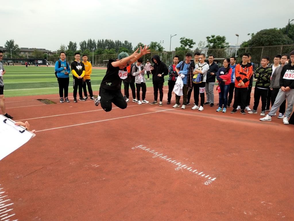 跳远比赛上,同学们使尽全力向着更远的距离更好的成绩飞跃。