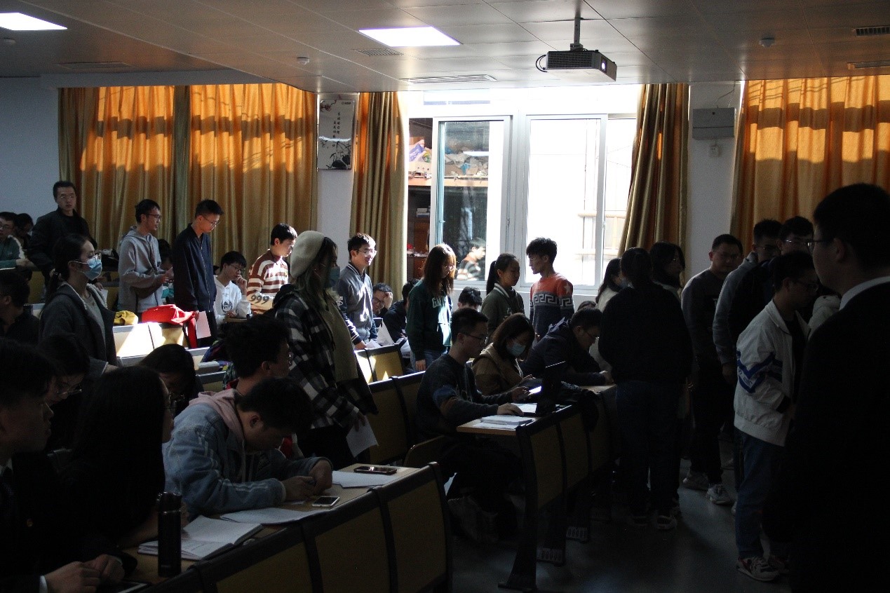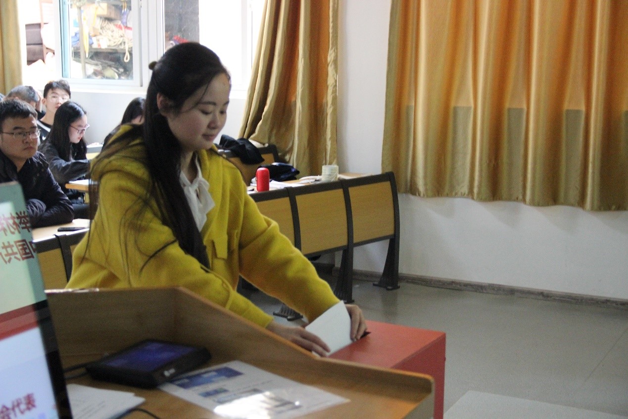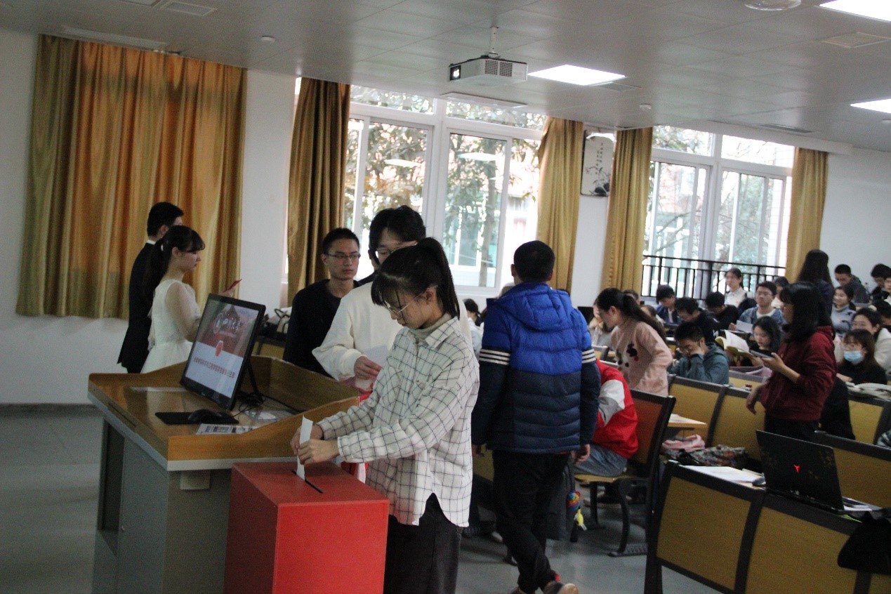 大会的第三阶段是选举新一届的学院学生会主席。首先由主持人展示主席候选人基本信息,而后由候选人发表竞选演讲,最后由学生代表依次上台投票。