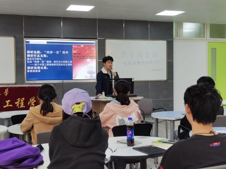 中共预备党员、2018级陈奕涵同学紧接着作关于红色调研主题发言,分享了其从开始立项到获得校级奖项的全流程,从科研旧址和问卷调查形式调研“两弹一星精神”,并表示大一大二的学生,时间充分,应该积极参加此类活动。恰逢“挑战杯”在我校举办,同学更应抓住机会,提升自己。