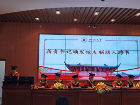蒋青教授为毕业生代表颁发校友联络人聘书,希望学院聘任的毕业生联络员陶智建、杨艾霖、刘士源等同学,能在走出校门后,继续团结全体2021届毕业生,互帮互助,共同进步。