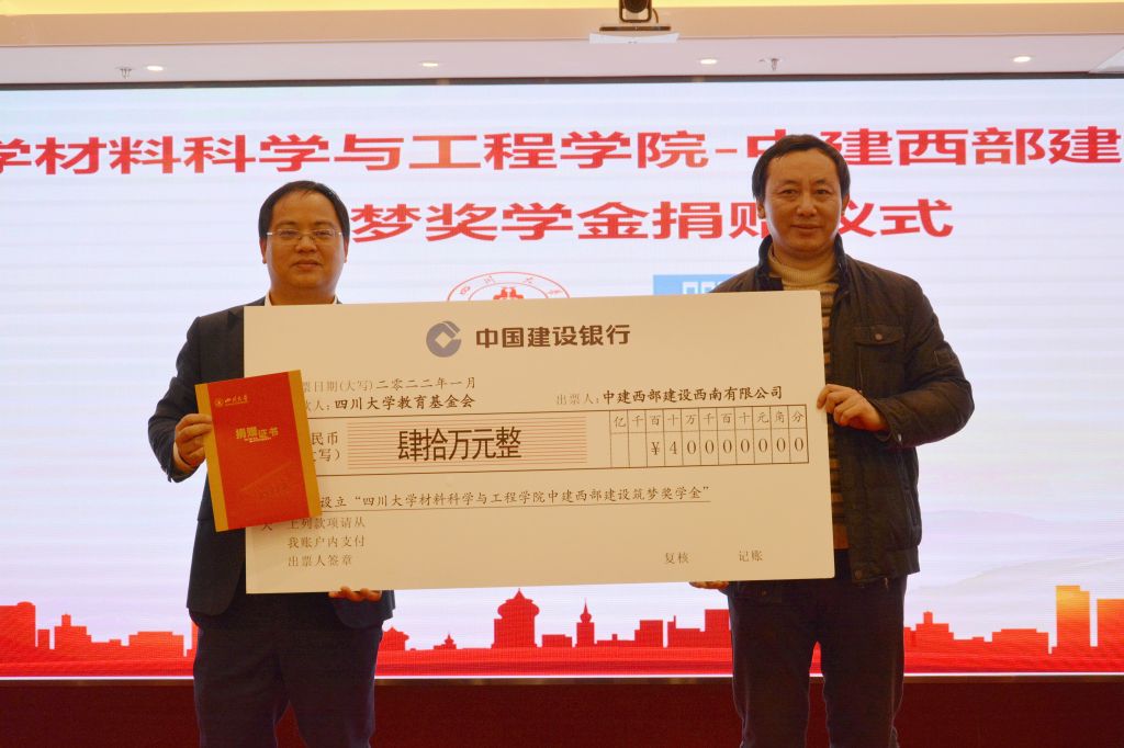 张利锋代表西南公司与川大基金会签订“中建西部建设筑梦奖学金”捐赠协议。根据协议,西南公司将分四年向川大3044am永利集团3044noc捐赠四十万元,用于奖励创新班优秀学生及冠名学院大型活动。