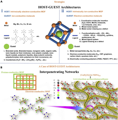 在这基础上,进一步提出了MOF与HOF(氢键有机框架)的互穿网络结构(“HOF-in-MOF”或“MOF-in-HOF”,图2B)实现新型混合质子-电子导体(mixed protonic-electronic conductor)的创新思路。