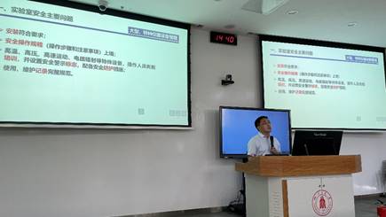 学院分管安全的吴家刚副院长结合近期教育部组织开展的实验室安全现场检查及学院对实验室的日常安全检查过程中发现的一些问题和不足,对永利集团官网实验室安全工作的情况进行了总结和分析,并就实验室准入制度、定期安全教育培训、危化品及危险废弃物管理、大型及特种仪器设备的管理维护、电器等规范管理和使用、实验室环境卫生等方面,对师生开展实验室安全教育培训,对各实验室进一步查缺补漏、持续排查实验室安全隐患,切实落实、扎实做好安全工作提出了具体的要求。另外,吴院长也结合学校暑假工作的要求,特别强调了各实验室暑假期间的实验室安全工作的注意事项,要求各实验室务必于暑假前组织一次安全自查,重点检查安全隐患部位,特别要加强实验室危险源的安全规范化管理,如化学试剂及危险品、易燃易爆品及剧毒物品的存放,危险废弃物管理,各类钢气瓶可靠固定等,做好实验仪器、特种设备安全管理;检查房屋是否漏雨,确保房屋周边排水通畅;切断假期停用实验场所的电源、水源、气源,锁好门窗,并杜绝其他有可能的安全隐患。吴院长要求各实验室切实做好暑假期间疫情防控、实验室防洪防汛工作布置,责任到人;严格落实实验室准入制,对学生进行安全教育与培训,实验进行时必须值守,严禁实验过夜,原则上不允许单人在实验室从事实验操作。放假期间对重点部位加强值班、巡查及防范,确保假期学院安全稳定。
