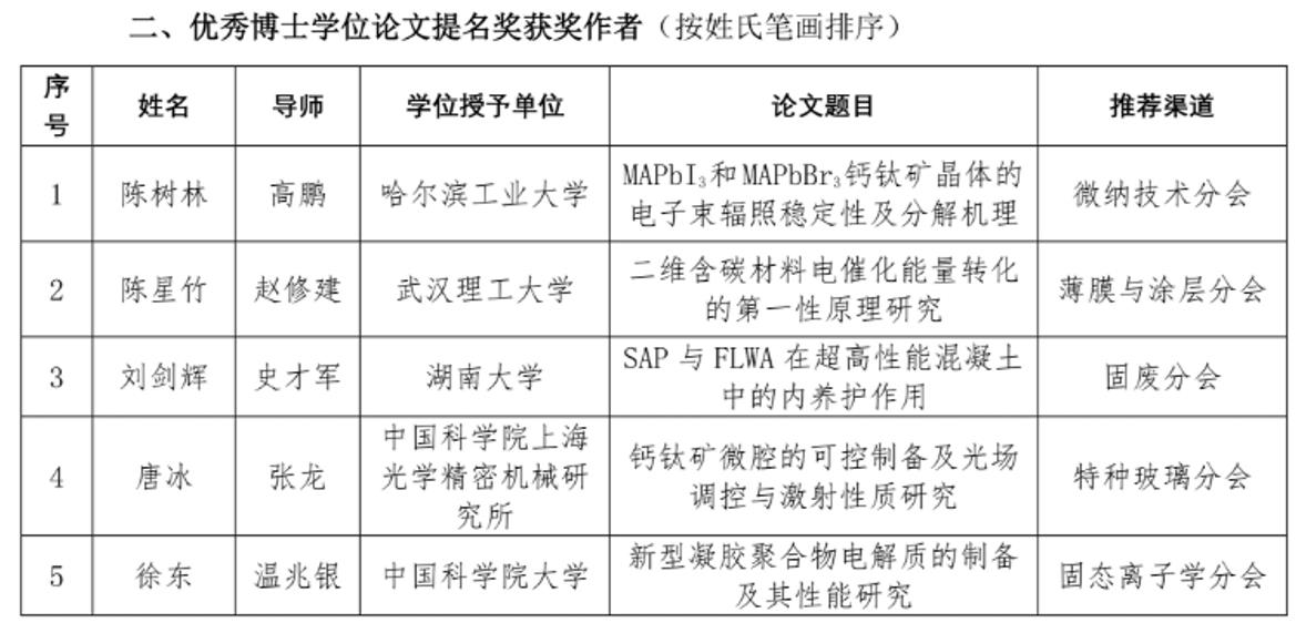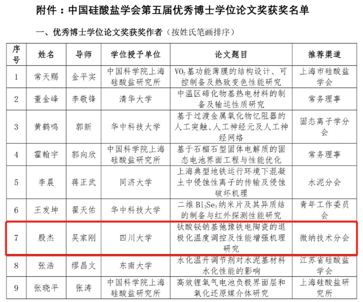 为促进我国无机非金属材料学科的发展,加强高层次创新性人才的培养工作,鼓励创新精神,提高博士研究生的教育质量,根据《中国硅酸盐学会优秀博士学位论文评选办法(试行)》规定,经专家评审委员评审、学会第九届理事会第六次常务理事会审议批准,3044am永利集团3044noc,吴家刚教授指导的博士生殷杰完成的博士学位论文《钛酸铋钠基弛豫铁电陶瓷的退极化温度调控及性能增强机理研究》荣获中国硅酸盐学会第五届优秀博士学位论文奖。该论文以钛酸铋钠(BNT)基弛豫铁电陶瓷为研究对象,以电学性能改性、结构操控并阐明其物理机制为目标,开展了系统且深入的研究工作。本届共有9篇博士学位论文获奖,5篇博士学位论文获提名奖。