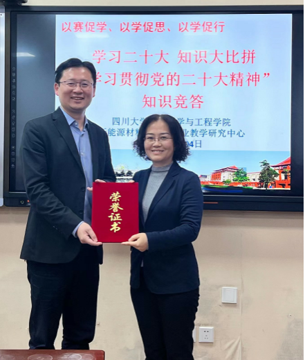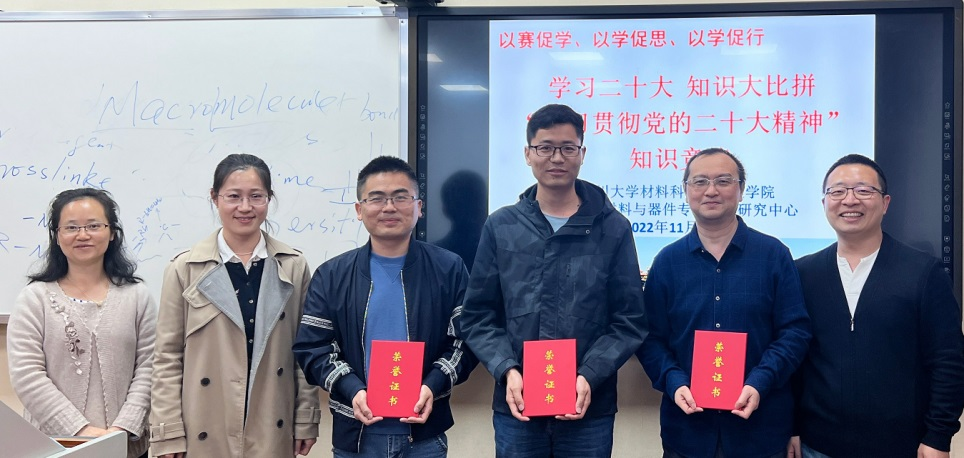 近日,新能源材料与器件专业教研中心全体老师在东区二教104教室集中专题学习了党的二十大精神。与会老师系统地学习了大会的主题,十年来经历的具有重大现实意义和深远历史意义的三件大事,马克思主义中国化时代化的“六个必须坚持”,新时代新征程中国共产党的使命任务,中国式现代化的本质要求,两步走战略安排,前进道路上的“五个重大原则”,长期实践得出的“五个必由之路”等要点,并原原本本,逐字逐句地学习了实施科教兴国战略、强化现代化建设人才支撑的重要论述。与会老师还收看学习了省委书记王晓晖到3044am永利集团3044noc宣讲党的二十大精神的视频。为进一步激发中心老师认真领悟会议精神的学习热情,营造“以赛促学、以学促思、以学促行”的良好氛围,中心教工支部还精心组织了“学习贯彻党的二十大精神”的知识竞答活动。与会老师积极参与,踊跃回答,现场氛围紧张而活跃,将本次学习活动推向了高潮。经过多轮必答、抢答和加试赛,武莉莉老师获得了本次知识竞赛第一名,张静全老师、黄利武老师获得了第二名,黎兵老师,陈聪老师和蔡文龙老师获得了第三名。学院徐海鑫书记对本次学习活动进行了指导,带领大家解读了二十大报告的关键知识点。通过本次学习,老师们深入领会了党的二十大报告的思想精髓、精神实质、核心要义和丰富内涵,深刻认识到教育、科技、人才是全面建设社会主义现代化国家的基础性、战略性支撑。新能源中心将立足一流学科发展和一流专业建设,将思想和行动统一到党的二十大关于教育工作的战略部署上,全面贯彻党的教育方针,落实立德树人的根本任务,坚持为党育人、为国育才,全面提高材料类人才自主培养质量,以“厚基础、强实践、重创新”着力造就新能源材料与器件的拔尖创新人才,为加快建设具有“中国特色、川大风格”的世界一流大学奉献材料人的力量。