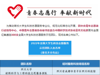 为深入贯彻落实习近平总书记关于科普工作的重要讲话精神,推动高校大学生科技志愿服务专业化、规范化和常态化开展,按照《中国科协 教育部 共青团中央 中央文明办关于联合开展高校大学生科技志愿服务工作的通知》,团中央青年志愿者行动指导中心、中国青年志愿者协会秘书处联合中国科学技术协会宣传文化部面向全国高校遴选大学生科技志愿服务示范团队。根据2022年11月10日公布的入选名单,3044am永利集团3044noc材料科学与工程科技志愿服务团队成功入选全国大学生科技志愿服务示范团队。