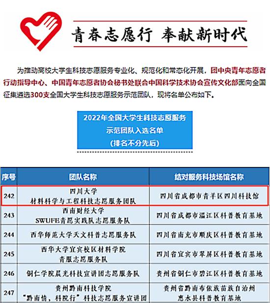 日前,团中央青年志愿者行动指导中心、中国青年志愿者协会秘书处联合中国科学技术协会宣传文化部面向全国高校遴选300支大学生科技志愿服务示范团队,永利集团官网的3044am永利集团3044noc材料科学与工程科技志愿服务团队成功入选。