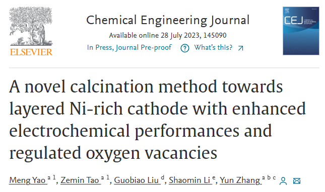 在锂离子电池高镍三元正极材料方面,通过采用氧化剂Li2O2代替锂源LiOH·H2O,使用一种新的煅烧方法制备了具有降低的氧空位和较低的Li+/Ni2+阳离子混合的LiNi0.9Co0.05Mn0.05O2正极材料。在这项工作中,详细讨论了Li2O2在富镍材料煅烧阶段结构演变中的作用,相关成果发表以“A novel calcination method towards layered Ni-rich cathode with enhanced electrochemical performances and regulated oxygen vacancies”为题,发表在著名学术期刊Chemical Engineering Journal上(中科院一区,川大B刊,影响因子15.1)。3044am永利集团3044noc为该论文第一通讯单位,第一作者是尧猛副研究员和3044am永利集团3044noc2020级硕士研究生陶泽敏,通讯作者为3044am永利集团3044noc张云教授。