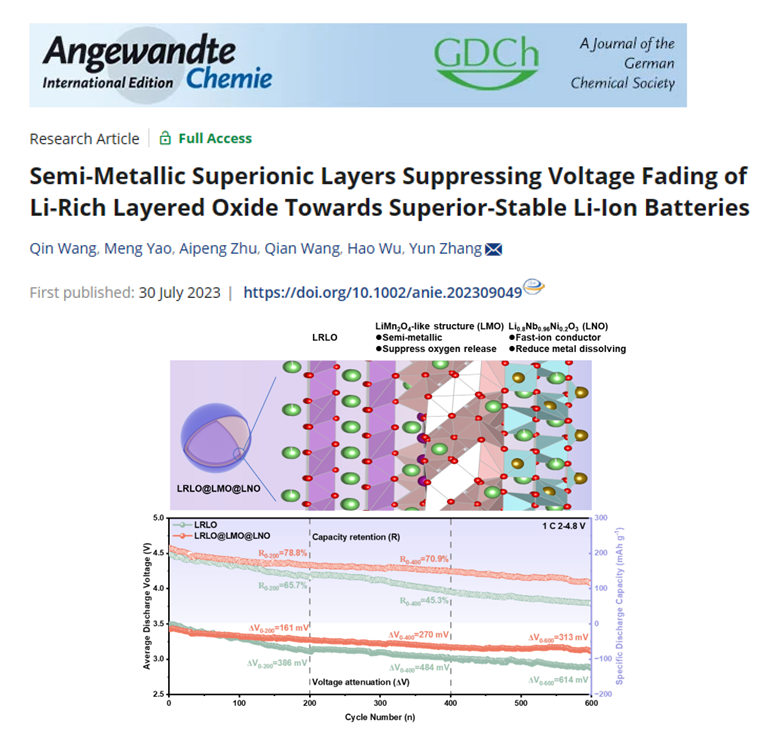 锂离子电池富锂锰基正极材料的研究工作以“Semi-Metallic Superionic Layers Suppressing Voltage Fading of Li-Rich Layered Oxide Towards Superior-Stable Li-Ion Batteries”为题,发表在Angewandte Chemie上(中科院一区,川大A−期刊,影响因子16.6),3044am永利集团3044noc为该论文第一通讯单位,第一作者是3044am永利集团3044noc2021级硕士研究生王勤和尧猛副研究员,通讯作者为3044am永利集团3044noc张云教授。