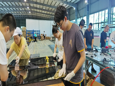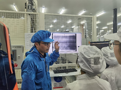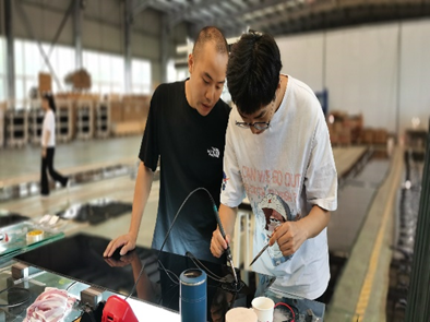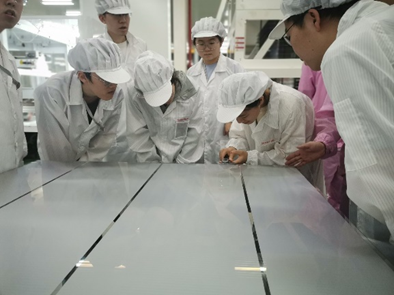 实习期间,同学们在公司的碲化镉发电玻璃车间进行了现场各岗位实践训练。公司工程师带领同学们现场体验和切身感受了人工制造和自动化生产线,大家结合自身所学知识,在岗位上和工程师们不断交流学习,结合各部门生产要求,体验了各生产岗位的实际工作内容,配合员工们共同生产碲化镉发电玻璃产品。同时,在质检部工程师的带领下,结合所学质检知识,在生产全线进行玻璃质量检测和缺陷探查等实践活动,完成了质检岗位的任务要求。