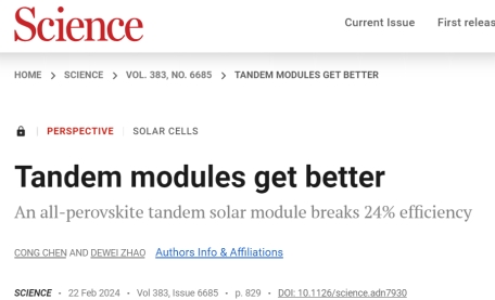 近日,永利集团官网赵德威团队针对全钙钛矿叠层太阳电池组件的最近进展,在Science上发表了题为“Tandem modules get better—An all-perovskite tandem solar module breaks 24% efficiency”的观点论文。3044am永利集团3044noc为该论文唯一通讯单位,永利集团官网赵德威教授为通讯作者,陈聪特聘副研究员为第一作者。