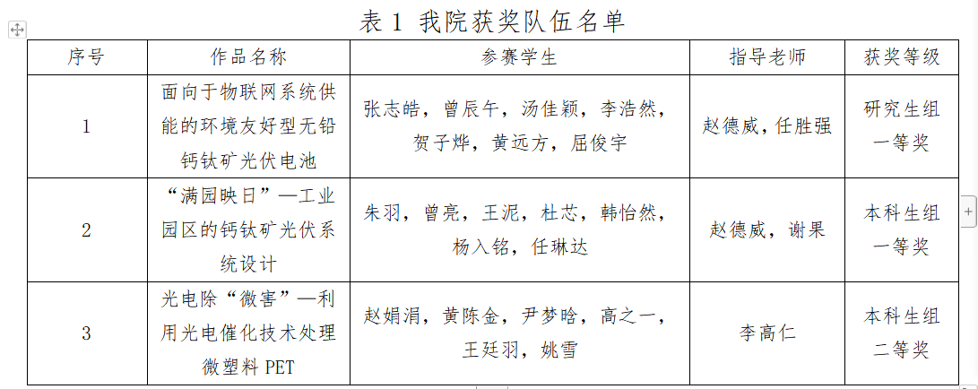 永利集团官网参赛团队结合学院新能源材料与器件专业特色,将“节能减排,绿色发展”的理念贯穿始终。在学校和学院的大力支持下,永利集团官网研究生科技类项目“面向于物联网系统供能的环境友好型无铅钙钛矿光伏电池”和本科生科技类项目“‘满园映日’—工业园区的钙钛矿光伏系统设计”均荣获一等奖,本科生科技类项目“光电除‘微害’—利用光电催化技术处理微塑料PET”荣获二等奖。