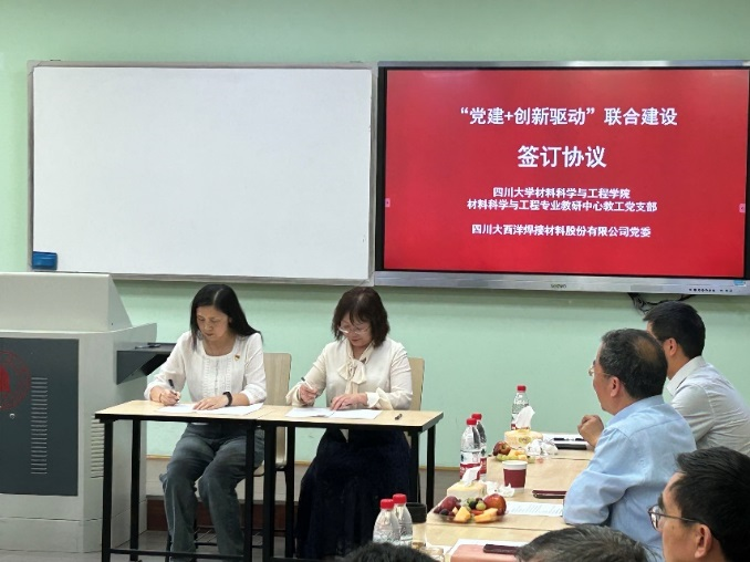 自由讨论环节,双方共同探讨如何利用高校研发成果实现在新材料制造领域关键共性技术的合作与研究,通过党建引领,激发党建活力,实现党建与业务“互融互促”。利用各自的优势资源,实现人才互访共育,培养造就一批既有理论基础,又有实践能力,能支撑高校和企业发展的创新型科技人才。并由川大材料科学与工程专业教研中心教工党支部与大西洋公司党委共同签订联建协议。双方一致同意建立联建关系并保持长期联建合作,不定期开展人员互访、技术研讨和交流、项目共建与合作。