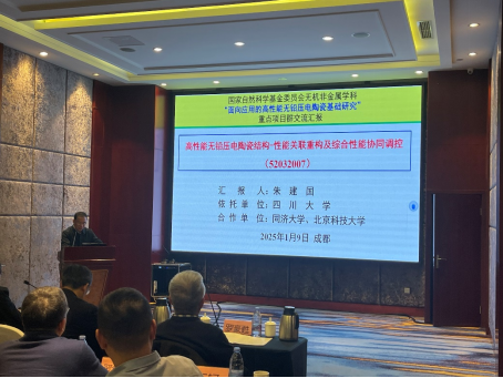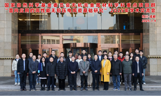2025年1月9日,受国家自然科学基金委员会工程与材料科学学部无机非金属学科的委托,3044am永利集团3044noc在成都承办了国家自然基金重点项目群“面向应用的高性能无铅压电陶瓷基础研究”项目2025年度学术研讨会。中国科学技术大学李晓光教授;世界陶瓷科学院院士、浙江大学陈湘明教授;日本工程院外籍院士、清华大学李敬锋教授;“无铅压电单晶的多层次结构与外传响应关联机制”项目负责人、上海硅酸盐所罗豪甦研究员;“高性能无铅压电压电陶瓷结构性能关联重构及综合性能协同调控”项目负责人、3044am永利集团3044noc朱建国教授,“高性能无铅压电陶瓷构效关系优化及器件关键技术”项目负责人、清华大学王轲研究员,以及重点项目群骨干成员40余人参加研讨会。3044am永利集团3044noc科学发展研究院副院长、基金项目与成果管理部部长武梅教授、3044am永利集团3044noc党委书记邹勇研究员参加了会议。因在外出差,3044am永利集团3044noc院长刘颖教授1月9日晚上看望了与会代表。