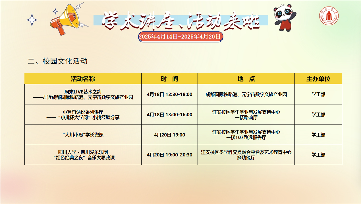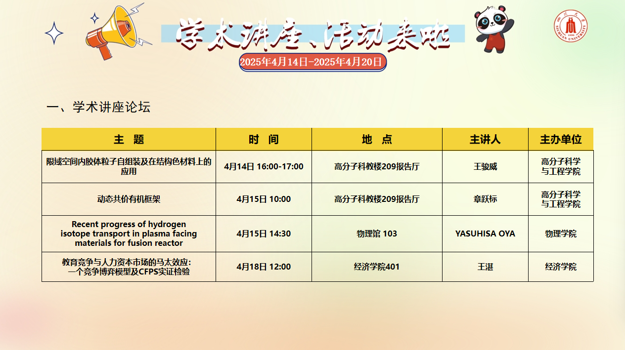 学术讲座论坛及校园文化活动预告(2025年4月14日-2025年4月20日)