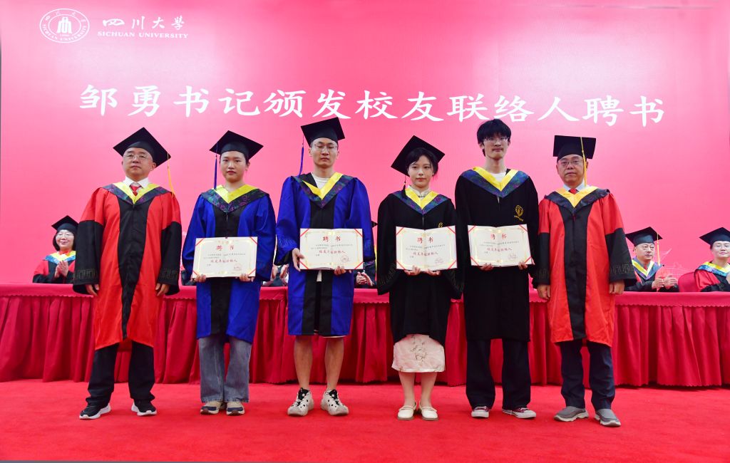 邹勇书记为学院的四位校友联络人同学颁发聘书,希望毕业同学们能常联络,工作之余、闲暇之时能多关心母校发展,常回母校看看。