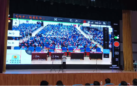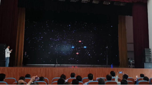 节目展演环节,通过视频讲解对无人机专业的核心课程、技术技能、就业情况等多方面进行了介绍,并在大屏幕上展示了由我院学生驾驶无人机测绘并通过专业软件合成的校园三维地图模型,通过模型可以实现目标地物的距离、面积的快速测量,该项技术有着广泛的应用前景。之后,无人机2101班张振伟同学驾驶大疆御2无人机演示了无人机驾驶员考证科目之一的“8字飞行”技术以及红外摄像、救援喊话等操作,赢得了现场观众的热烈掌声。无人机2101班袁灿杰同学进行了无人机蜂群的编队表演,通过室内基站、远程端控制软件等多重“黑科技”护航下,操作员控制多架无人机的飞行路线、飞行速度、空间坐标等参数以及LED灯的亮度和闪烁频率,将无人机编队变换成形式多样、美轮美奂的组合造型,以灯光传情,以光影达意,用科技感和灯光的魅力在空中营造出一场华丽的视觉盛宴,在场师生们纷纷拿出手机记录下这精彩的时刻。“这个无人机表演太震撼了,让我们充分感受到了学校职业教育活动周即将到来的浓厚氛围。”同学们纷纷表示自己看得意犹未尽,赞不绝口。