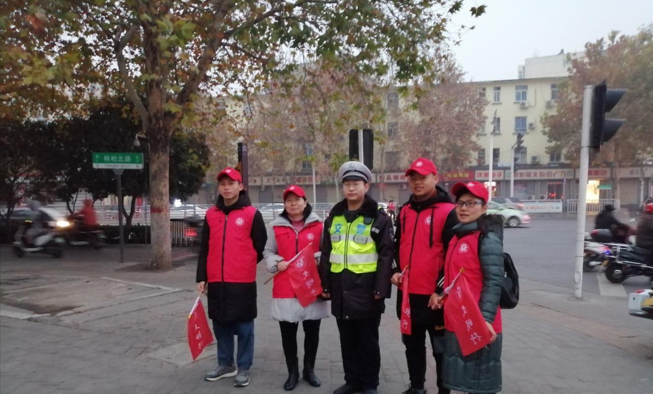 为了进一步推动郑州市文明城市建设,我校承担了桐柏路和棉纺路交通岗文明出行的交通志愿服务活动。2019年12月25日早上7点20分,beat365正版唯一官网党总支邓艳丽副书记带领文明交通岗志愿服务团队到达岗位,并与该路口的交通民警进行沟通,具体了解执行任务要求。然后开始协助民警维持早高峰7点半至8点半的交通秩序,及时劝阻一些不文明出行行为。
