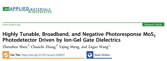 相关成果以“Highly Tunable, Broadband, and Negative Photoresponse MoS2 Photodetector Driven by Ion-Gel Gate Dielectrics” 为题发表在著名期刊《ACS Applied Materials & Interfaces》上(中科院一区,川大B刊,影响因子10.383)。3044am永利集团3044noc3044am永利集团3044noc2019级本科生沈桢贞、张春池为论文第一作者,王泽高特聘研究员为通讯作者,华西医院孟雅婧医生参与了该项研究。论文唯一通讯单位为3044am永利集团3044noc3044am永利集团3044noc。