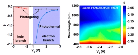 在此,研究人员利用PVDF-EMIM-TFSI作为凝胶电介质,制备了一种基于二硫化钼的离子凝胶晶体管。通过调节栅极电压,二硫化钼表现出双极性电特性,并在此基础上研究电子、空穴载流子的光电效应。发现二硫化钼光电晶体管在电子分支和空穴分支中都表现出反常的负光电效应。C2F6NO4S2-离子的吸附/解吸在电子分支中占主导地位,而photogating效应在空穴分支中占主导地位。通过调节栅极电压,可以调节载流子浓度,从而调节光-物质的相互作用。因此,电子分支的光响应率和探测率可达21.79 A/W2.45×1011 Jones,空穴分支的光响应和探测率分别为7.82 A/W1.12×1011 Jones。此外,光响应甚至可以从可见光区域延伸到近红外区域。本研究提供了外场调谐光响应,揭示了空穴/电子主导材料的研究机制,并为未来通信和可穿戴医疗保健电子器件提供了参考。