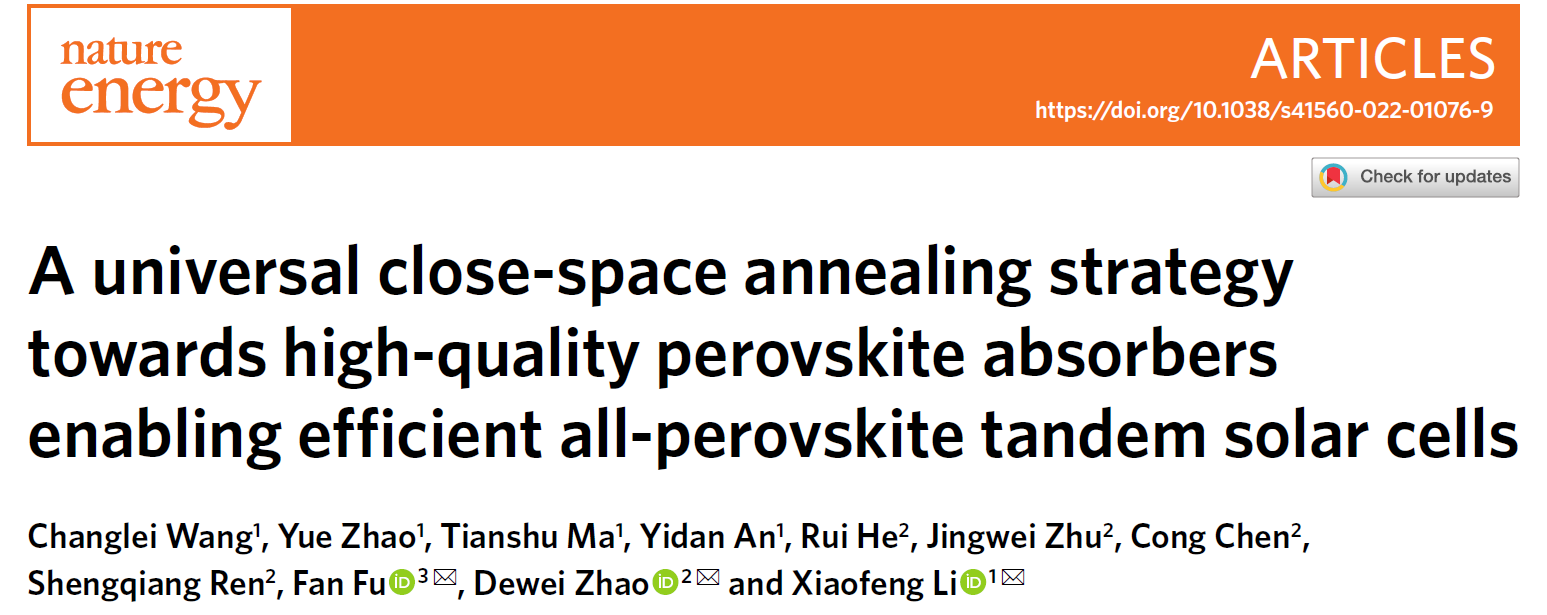 北京时间2022年7月21日,国际顶尖学术期刊Nature Energy在线发表了永利集团官网太阳能所赵德威教授、苏州大学李孝峰教授和瑞士联邦材料科学与技术研究所(EMPA)付帆博士合作团队题为“A universal close-space annealing strategy towards high-quality perovskite absorbers enabling efficient all-perovskite tandem solar cells”的研究成果。合作团队提出了限域退火方法制备高质量钙钛矿结晶薄膜的策略,并且该方法对于不同组分钙钛矿薄膜具有普适性,最终实现了效率超过25%的全钙钛矿叠层太阳能电池。