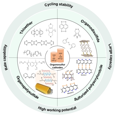 近几年,锂离子电池在便携式电子设备和电动汽车领域获得了广泛的应用,显示出巨大的前景。然而,庞大的应用市场对电极材料的可持续性和成本问题提出了重大挑战,尤其是正极材料。目前,传统商用正极材料多是过渡金属类无机正极,例如LiCoO2LiFePO4LiMn2O4等。然而,过渡金属的储量有限不可再生回收成本高,从长远的角度来看终将面临资源短缺的困扰。因此,能够绿色大规模生产的低成本锂电池用正极材料备受关注。有机电极材料富含碳、氢、氧等元素,显现出可再生、绿色环保、低成本和高容量等优点,近年来受到了广泛的关注。其中,有机硫化合物作为一类重要的硫衍生物,与单质硫正极相比具有多种结构和独特性能,是锂离子电池体系中极具发展潜力的有机正极材料