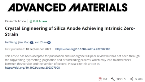 近日,永利集团官网毛健教授团队在材料学顶级期刊Advanced Materials发表题为:Crystal Engineering of Silica Anode Achieving Intrinsic Zero-Strain的研究。第一作者为副研究员(专职科研)王飞,该文通讯作者为3044am永利集团3044noc的毛健教授和赵焱教授,第一作者单位为3044am永利集团3044noc。该研究提出了一种新型的零应变硅基负极材料结构设计方式,对于硅基负极材料的科学研究和商业化都具有重要意义。
