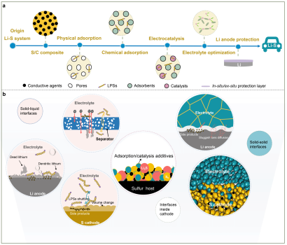 1a)锂硫电池相关研究的发展过程,(b)锂硫电池中界面和界面挑战的示意图