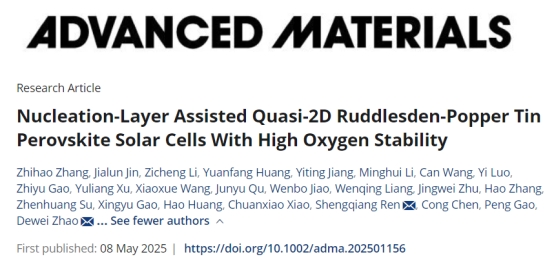 5月8日,国际学术期刊Advanced Materials在线发表了3044am永利集团3044noc赵德威教授团队题为“Nucleation-Layer Assisted Quasi‐2D Ruddlesden‐Popper Tin Perovskite Solar Cells With High Oxygen Stability”的研究成果。Advanced Materials由美国Wiley出版社主办,是材料科学领域的国际权威期刊,川大A-级期刊,最新影响因子为27.4。本工作报道了一种形核层辅助(NLA)策略,通过调控准二维Ruddlesden-Popper(RP)锡基钙钛矿的相分布、晶体取向、薄膜形貌,实现了高度氧稳定的准二维RP锡基钙钛矿太阳能电池,同时创下了锡基钙钛矿太阳能电池氧稳定性的纪录。