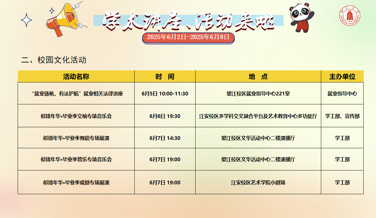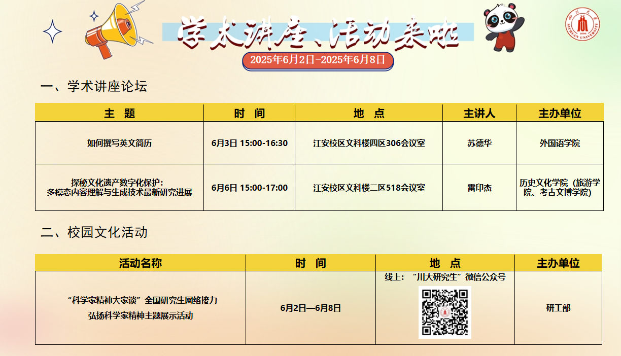 学术讲座论坛及校园文化活动预告(2025年6月2日-2025年6月8日)