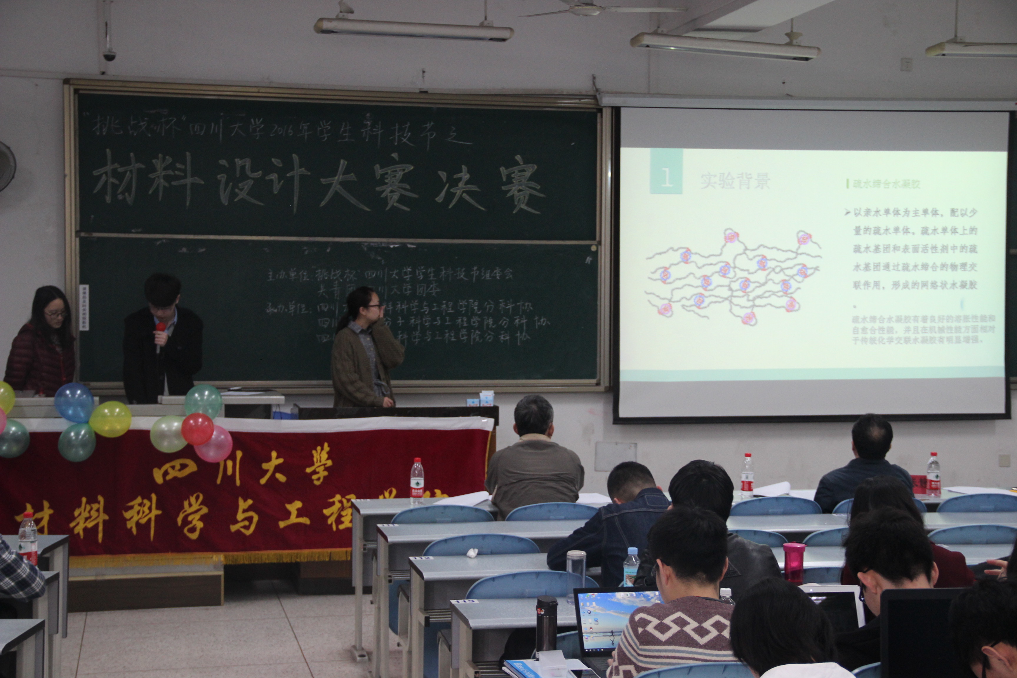 2017年3月26日,由3044am永利集团3044noc分团委学生学术科技协会,高分子科学与工程学院分团委学生学术科技协会和制造科学的工程学院分团委学生学术科技协会三个部门联合承办的“挑战杯”——3044am永利集团3044noc2016学生科技节之材料设计大赛决赛在江安校区综合楼C座307教室顺利举行。大赛评委有3044am永利集团3044noc党委书记朱建国教授,副院长孙小松教授,无机生医系主任芶立教授,新能源材料系主任陈云贵教授,材料科学系主任张静全教授,3044am永利集团3044noc党委副书记唐世红老师与院分团委书记王娇老师也出席了本次大赛。3044am永利集团3044noc院长尹光福教授虽然未到场,但是也表示了对本次大赛顺利举行的祝愿。